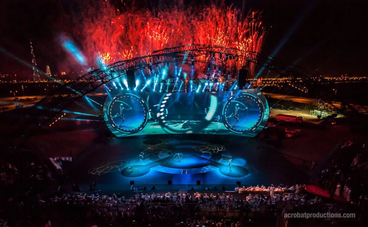For the 4th annual Dubai International Parachute Championships hosted by the Crown Prince of Dubai Sheikh Hamdan bin Mohammed bin Rashid Al Maktoum, Acrobat Productions were privileged to be invited to choreograph a custom Cyr Wheel performance in the style of Tron for the opening Ceremonies.